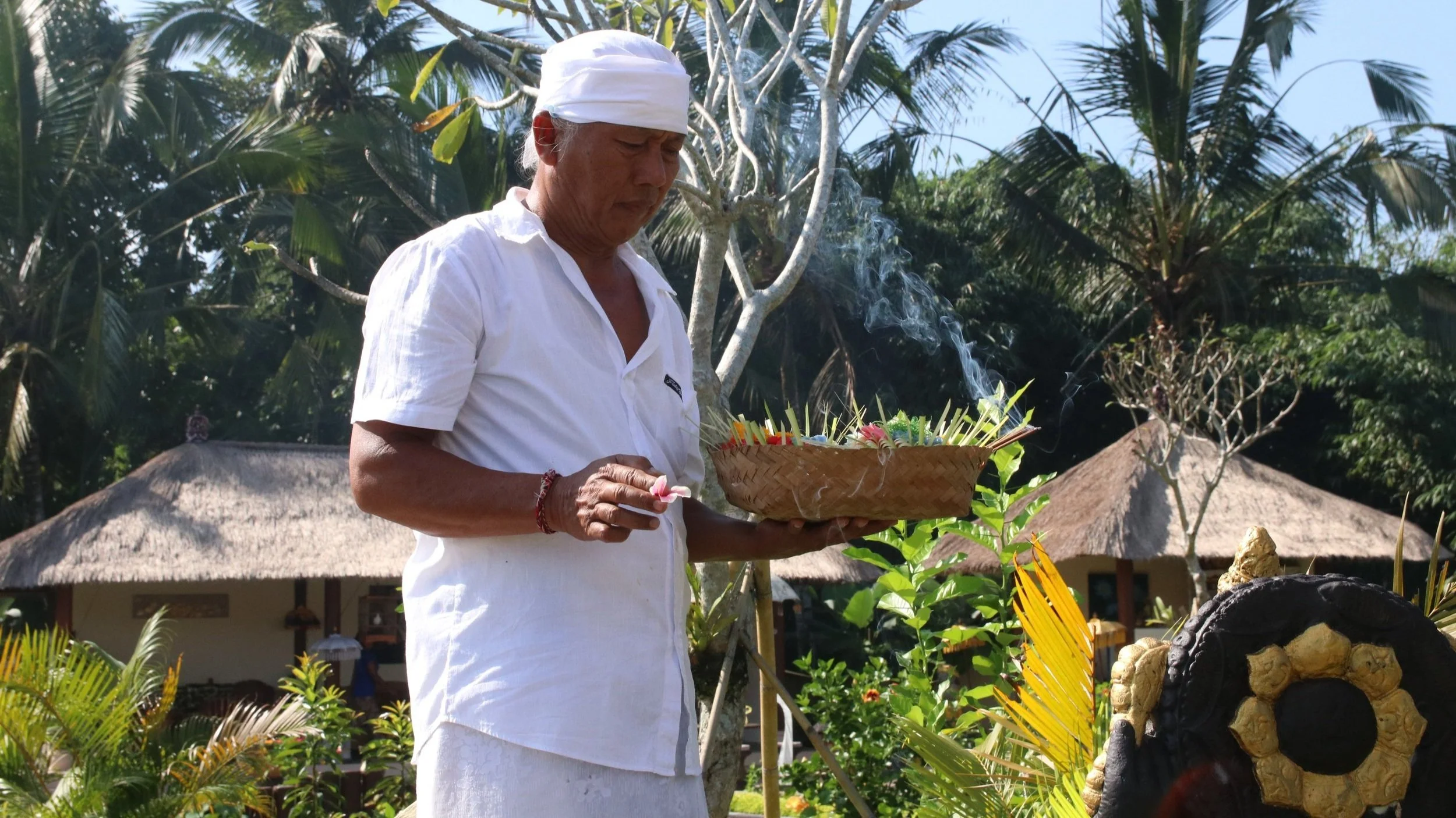 Pak Mangku is a Balinese High Priest, who has been spiritually supporting the local people for most of his life. Pak Mangku performs purification ceremonies and prayer blessings daily. He is working directly with the sacred land, ancient Temples and holy water sites.