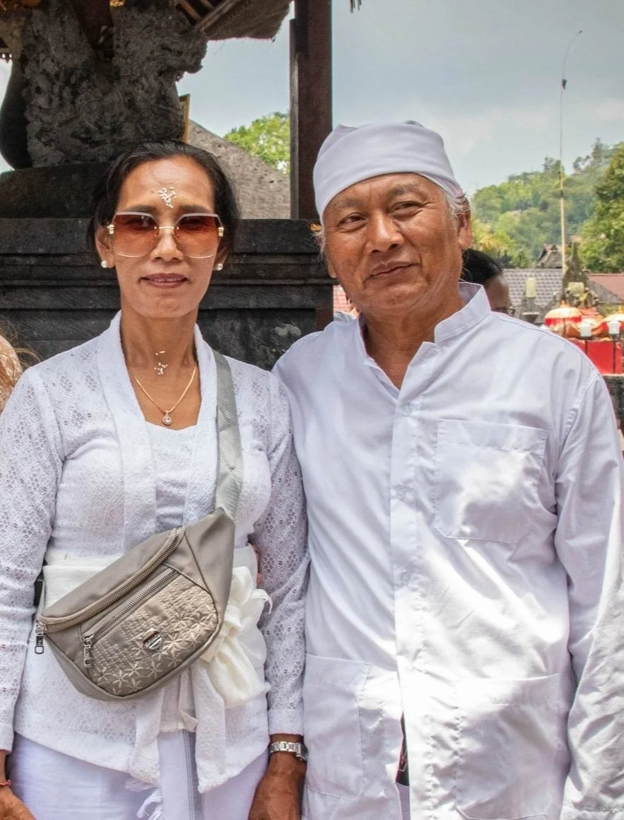 Ibu Mangku is Pak Mangku’s wife, and they work closely together. They are giving their lives, time and money to serve the local community. Ibu Mangku spends most days in the Temple and her evenings preparing for ceremonies and offerings for the prayer blessings.
